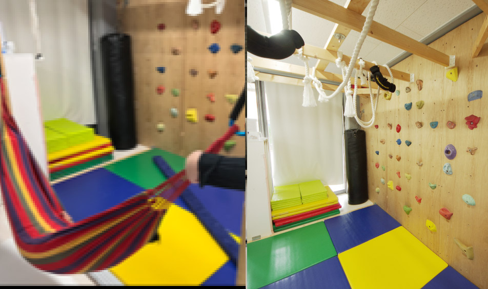 ハンモックや平均台でのバランス感覚。ボルダリングでの掴む・踏ん張る・しがみつく。